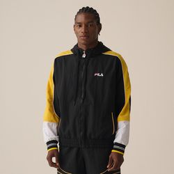 Campera de hombre con capucha confeccionada en tejido plano de poliamida. De calce comfort, más holgado en el cuerpo, con cuello alto y manga larga. Su tejido contiene tecnologías FLOW, que ofrece un secado rápido y mantiene el cuerpo a la temperatura ideal para practicar deporte, y UV PROTECTION, que proporciona protección solar SPF 50+ frente a los rayos UVA y UVB. Tiene apertura frontal con cierre y tiracierre F-Box, cordón de ajuste y capucha forrada, bolsillos delanteros, puños tejidos, ruedo con elástico interno, detalles de ribetes cosidos aplicados en las mangas y logotipo Fila Letter de dos tonos bordado en la parte superior izquierda.